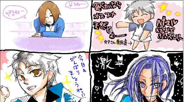 まずは手慣らしに落描。左上匿名さん、左下三波さん、右下識さん、右上の頭悪そうなパクネタが私です…。歌詞が間違ってる所はスルーして下さい…