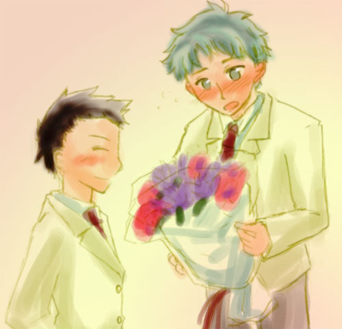 ■オススメ公式シーンNO.1 推薦人:穂香様 オススメシーン:9月26日に発売された宍戸さんのシングル『EMBLEM』のボーナストラック。 理由:公式で宍戸さんに花束をあげる長太郎っ…! ついつい逃げてしまう辺り公式ではへたれ攻めか(笑) でも最後は長太郎を探してあげる宍戸さん!これこそ、宍鳳でしょう♪ 管理人からコメント: オススメ公式シーンへのご投稿ありがとうございます。 宍鳳界隈ではもっぱら評判の悪い(笑)例のボーナストラックですね! 私も脳内ががっつり宍鳳フィルターかかっているため、何の問題もなく宍鳳妄想に繋ぐことができました。 花を持っている長太郎のあまりの可愛さに思わずダッシュしてしまったのだと(勝手に)思っていますが(…)ヘタレ攻めでも愛しています!(笑) …せっかくなので、No.1のオススメシーンを妄想したラクガキを載せておきます…(笑)